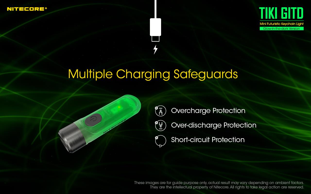 The Nitecore TIKI GITD has a built-in 130mAh Li-ion battery which is rechargeable via a micro USB port at the base of the light, allowing for fast, convenient charging. The keyring torch has multiple charging safeguards including overcharge protection, over-discharge protection and short circuit protection, plus a blue charging indicator that turns off when the battery is fully charged.