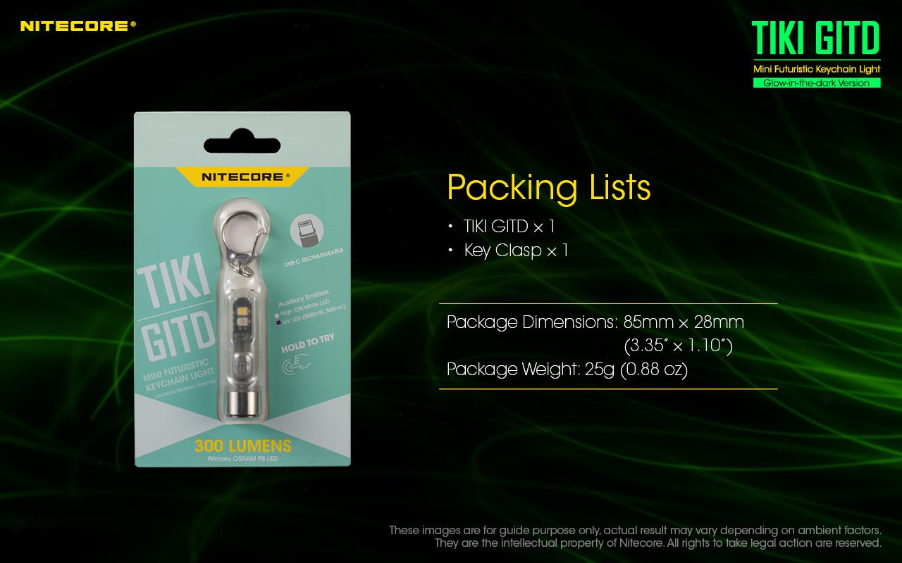 The Nitecore TIKI GITD keyring light features a phosphorescent shell which will glow in the dark. The torch has a maximum output of 300 lumens from the primary OSRAM P8 LED with a reflective optic lens emitting a soft, uniform beam.