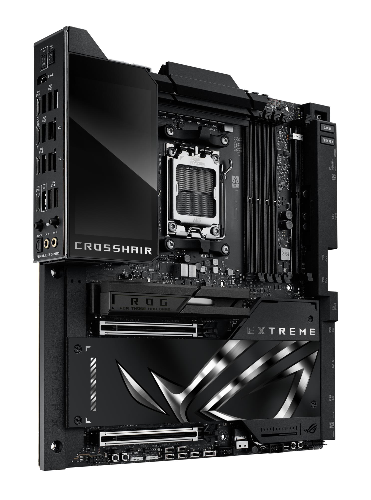 Summary: ASUS ROG CROSSHAIR X870E EXTREME. Processor manufacturer: AMD, Processor socket: Socket AM5, Compatible processor series: AMD Ryzen 7000 Series, AMD Ryzen 8000 Series, AMD Ryzen 9000 Series. Supported memory types: DDR5-SDRAM, Maximum internal memory: 256 GB, Memory slots type: DIMM. Supported storage drive interfaces: M.2, SATA III, SlimSAS, Supported storage drive types: HDD & SSD, RAID levels: 0, 1, 5, 10. Ethernet interface type: 5 Gigabit Ethernet, 10 Gigabit Ethernet, Top Wi-Fi standard: Wi-Fi 7 (802.11be), Wi-Fi standards: Wi-Fi 7 (802.11be). Component for: PC, Motherboard form factor: Extended ATX, Motherboard chipset family: AMD