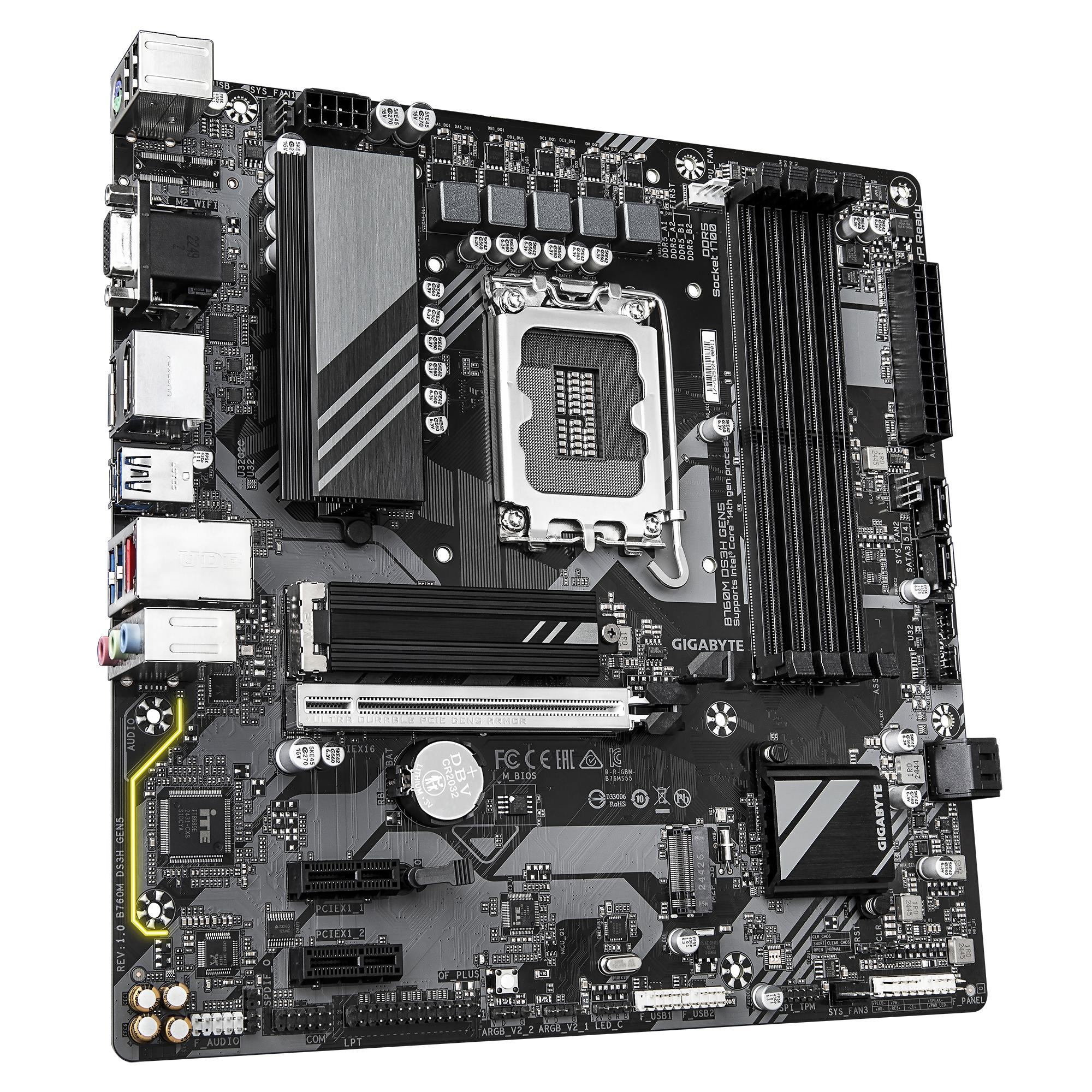 Summary: GIGABYTE B760M DS3H GEN5 Motherboard - Supports Intel Core 14th Gen CPUs, 6+2+1 Phases Digital VRM, up to 5600MHz DDR5, 2xPCIe 4.0 M.2, 2.5GbE LAN, USB 3.2 Gen2. Processor manufacturer: Intel, Processor socket: LGA 1700, Compatible processor series: Intel® Celeron®, Intel Core i3 12th Gen, Intel Core i3 13th Gen, Intel Core i3 14th Gen, Intel.... Supported memory types: DDR5-SDRAM, Maximum internal memory: 256 GB, Memory slots type: DIMM. Supported storage drive interfaces: M.2, PCI Express 4.0, SATA III, Supported storage drive types: HDD & SSD, RAID levels: 0, 1, 5, 10. Maximum resolution: 4096 x 2304 pixels. Ethernet interface type: 2.5 Gigabit Ethernet, LAN controller: Realtek RTL8125