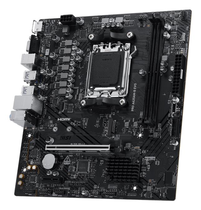 Summary: MSI PRO A620AM-B EVO. Processor manufacturer: AMD, Processor socket: Socket AM5, Compatible processor series: AMD Ryzen 7000 Series, AMD Ryzen 8000 Series, AMD Ryzen 9000 Series. Supported memory types: DDR5-SDRAM, Maximum internal memory: 128 GB, Memory slots type: DIMM. Supported storage drive interfaces: M.2, SATA III. Ethernet interface type: 5 Gigabit Ethernet. Component for: PC, Motherboard form factor: ATX, Motherboard chipset family: AMD