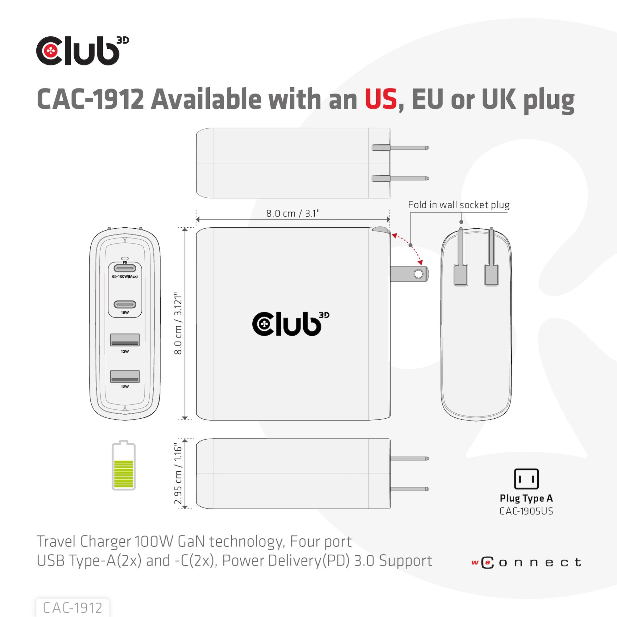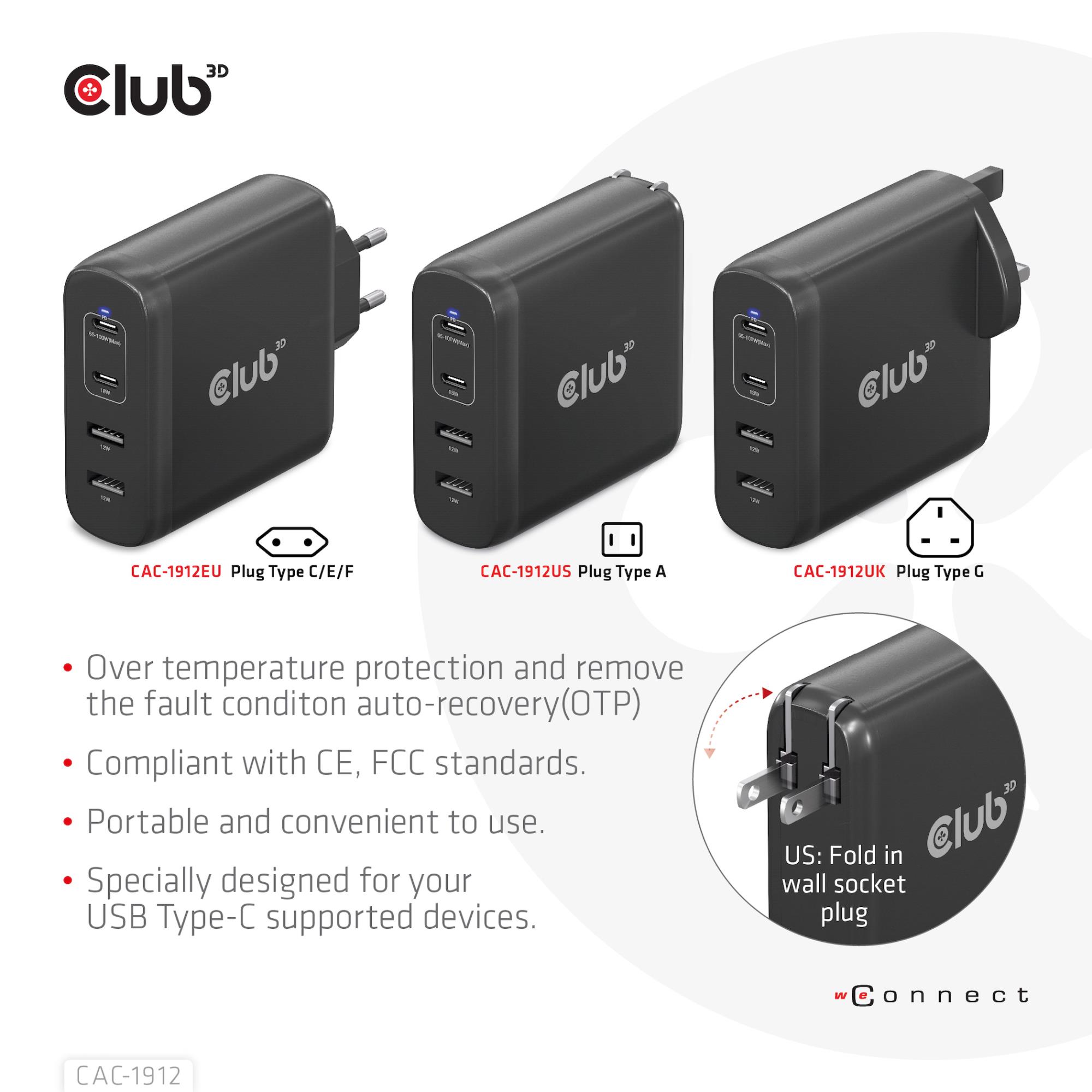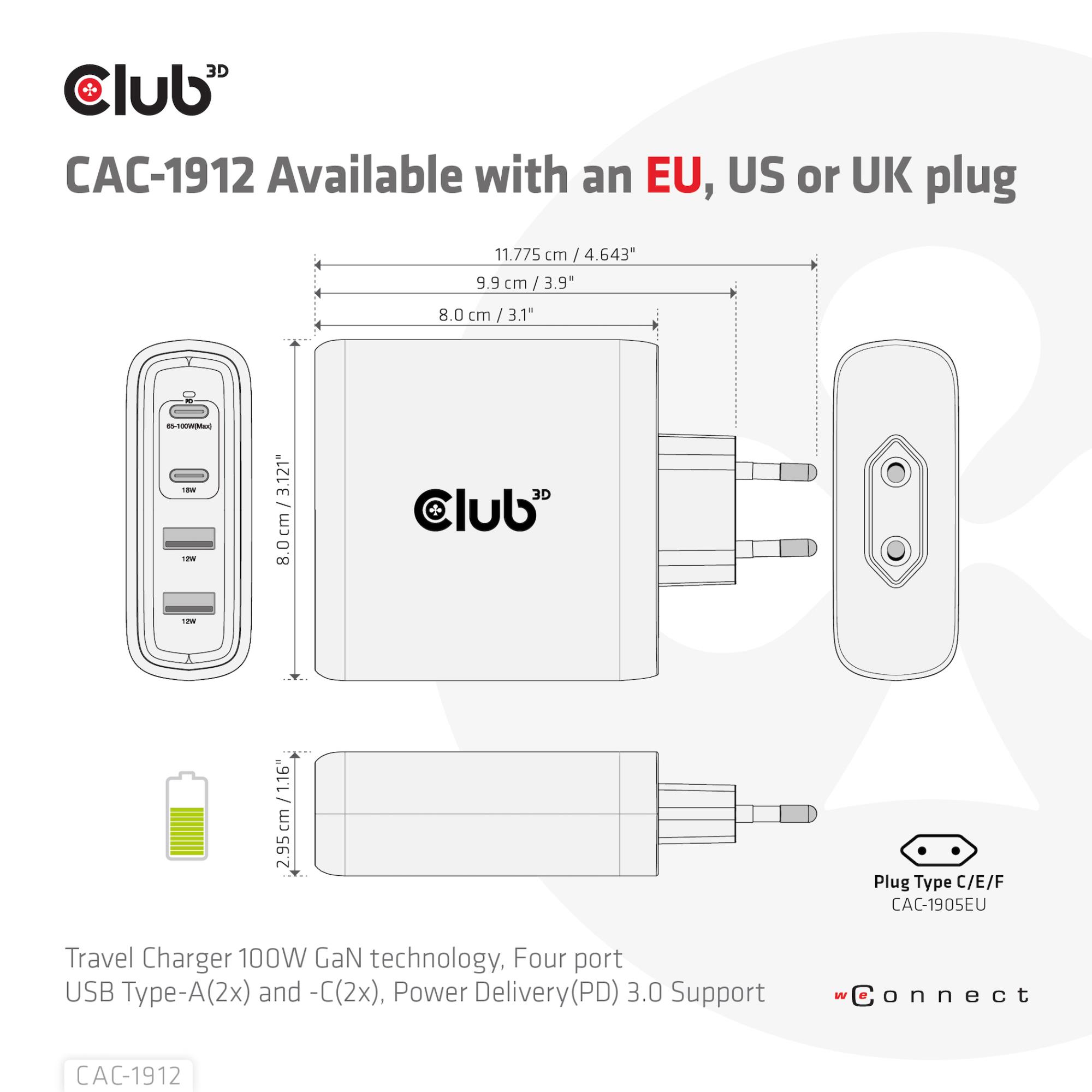 Summary: CLUB3D Travel Charger 100W GaN technology, Four port USB Type-A(2x) and -C(2x), Power Delivery(PD) 3.0 Support. Charger type: Indoor, Power source type: AC, Charger compatibility: Universal. Input voltage: 100 - 240 V. USB Type-C ports quantity: 2, Power protection features: Over current, Short circuit. Product colour: Black