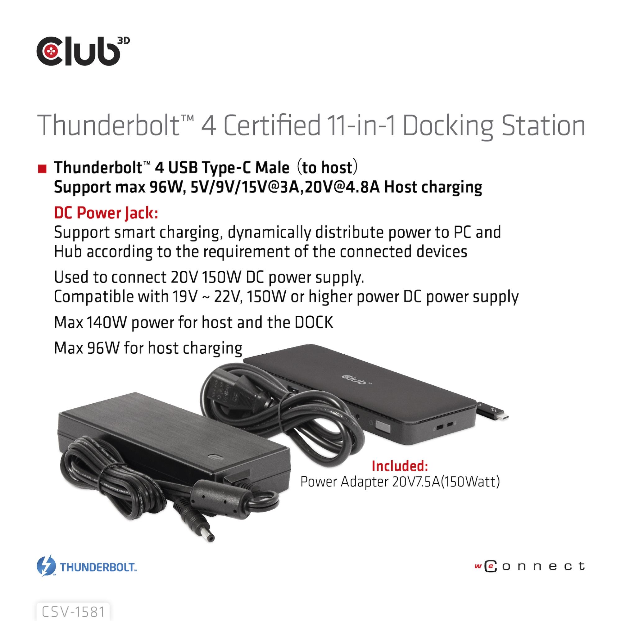 Included Accessories: • CSV-1581 Thunderbolt™ 4 Certified 11-in-1 Docking Station • Power Adapter 20V7.5A(150Watt)
