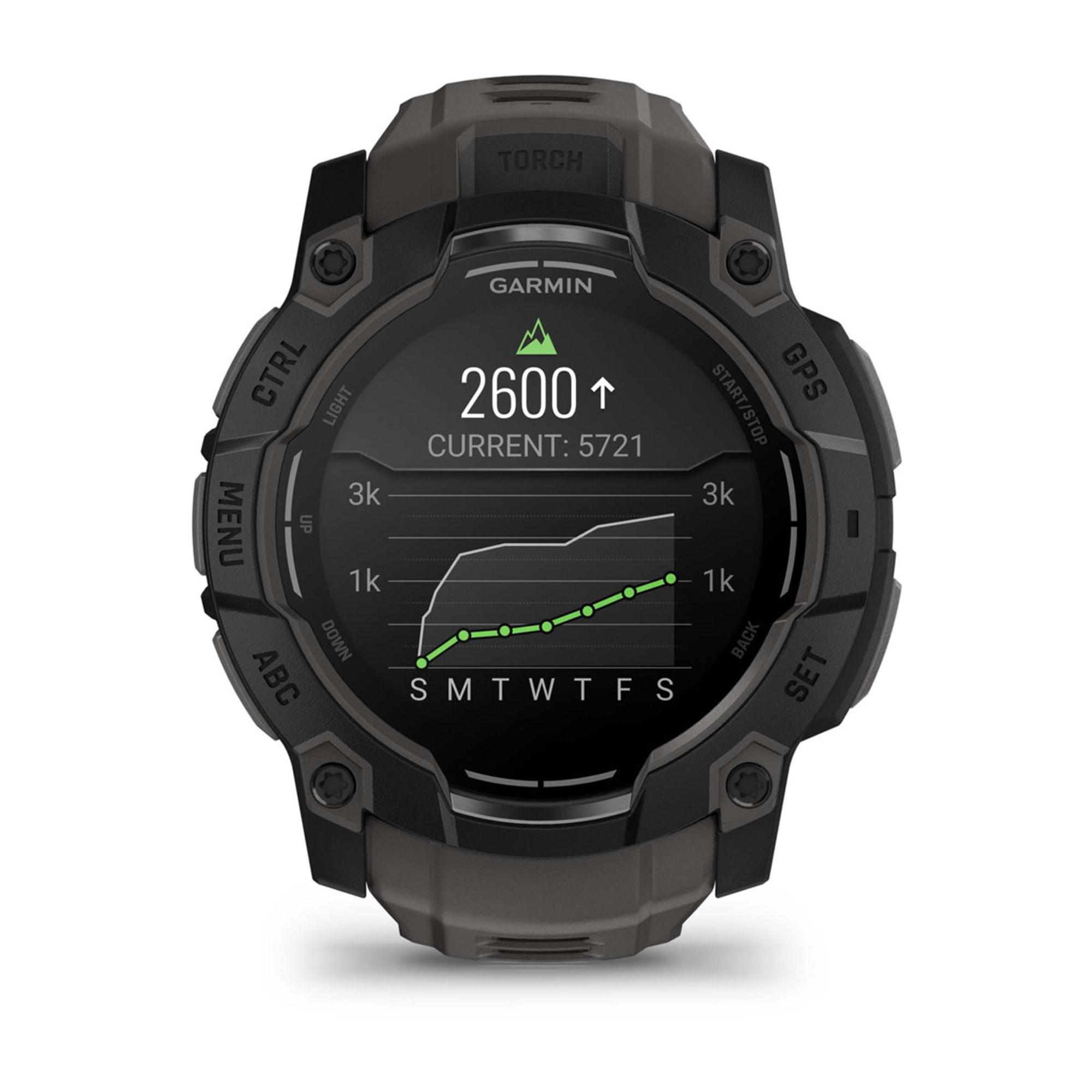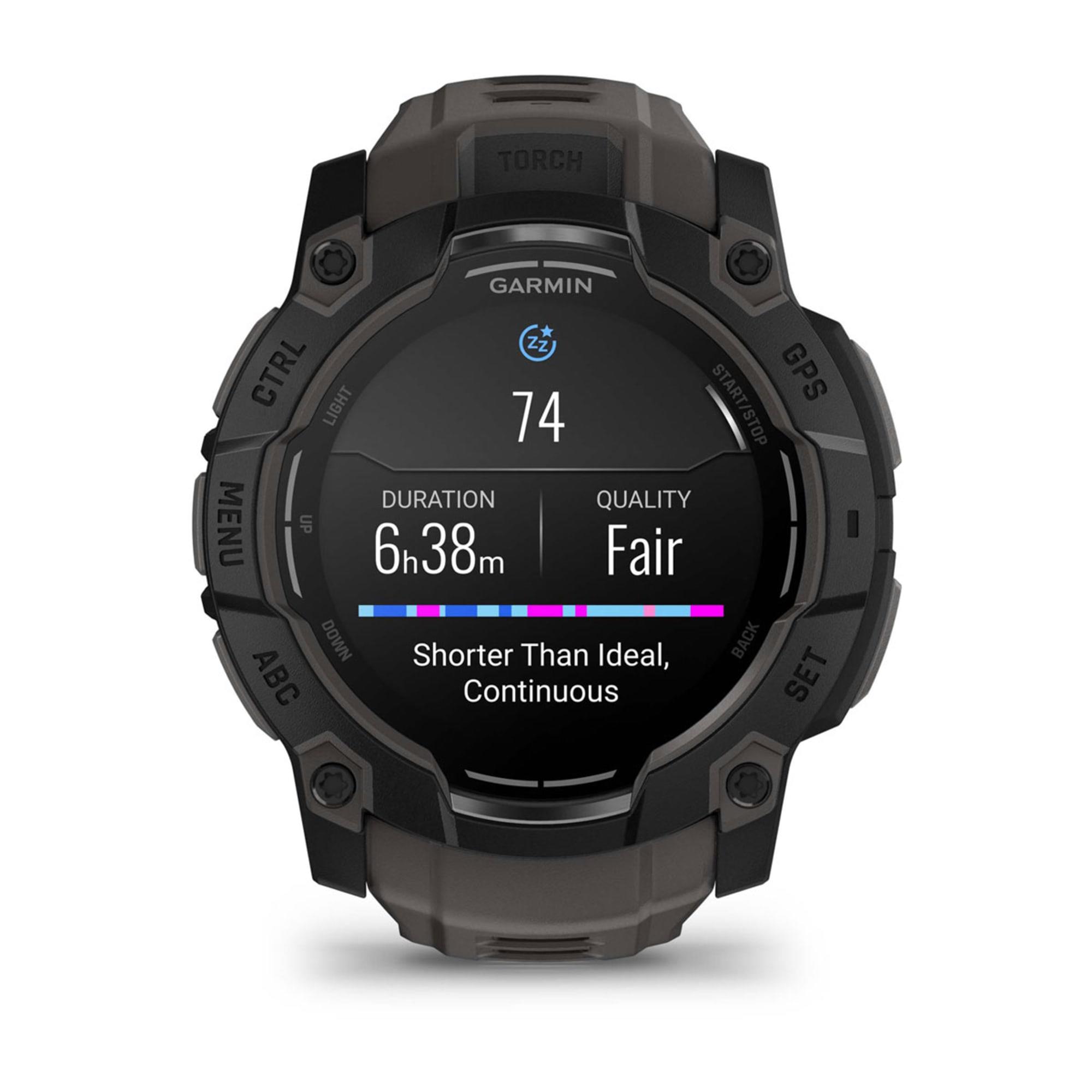 Summary: Garmin Instinct 3 AMOLED. Display diagonal: 3.3 cm (1.3"), Display technology: AMOLED, Display resolution: 416 x 416 pixels, Touchscreen. Flash memory: 4 GB. GPS (satellite). Weight: 59 g. Band material: Silicone, Band colour: Black