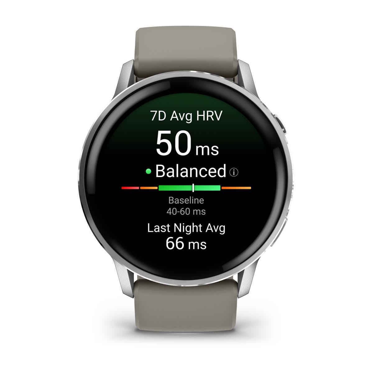 Summary: Garmin Venu 4. Display diagonal: 3.56 cm (1.4"), Display technology: AMOLED, Display resolution: 454 x 454 pixels, Touchscreen. Flash memory: 8 GB. Wi-Fi. GPS (satellite). Weight: 38 g. Band material: Silicone, Band colour: Grey, Silver