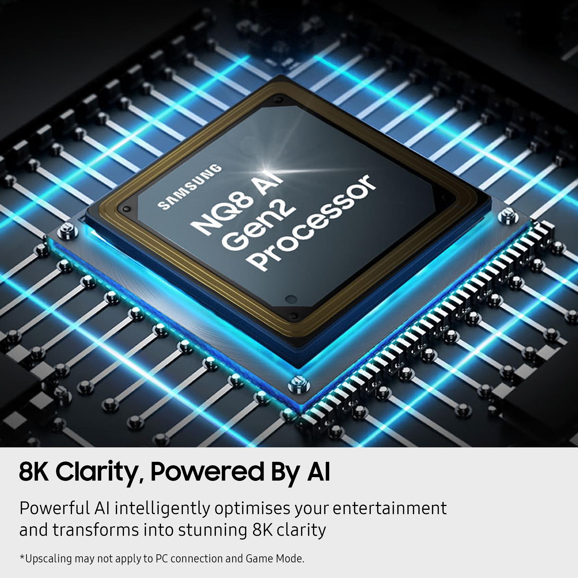 Brand-specific features: NQ8 AI Gen2 Processor, 8K AI Upscaling, Glare Free, Neo Quantum HDR 8K Pro*, Quantum Matrix Technology PRO, Dolby Atmos®, Metal Frame Design, AI Motion Enhancer, Object Tracking Sound+, Motion Xcelerator 165Hz, PANTONE Validated, Samsung Q-Symphony, Smart