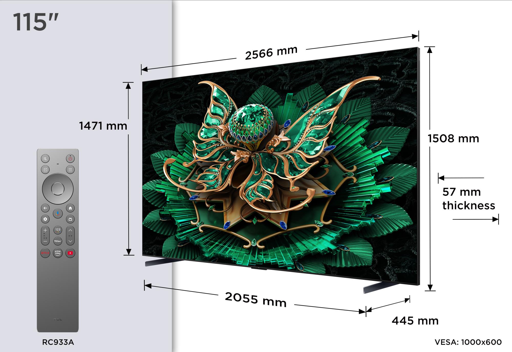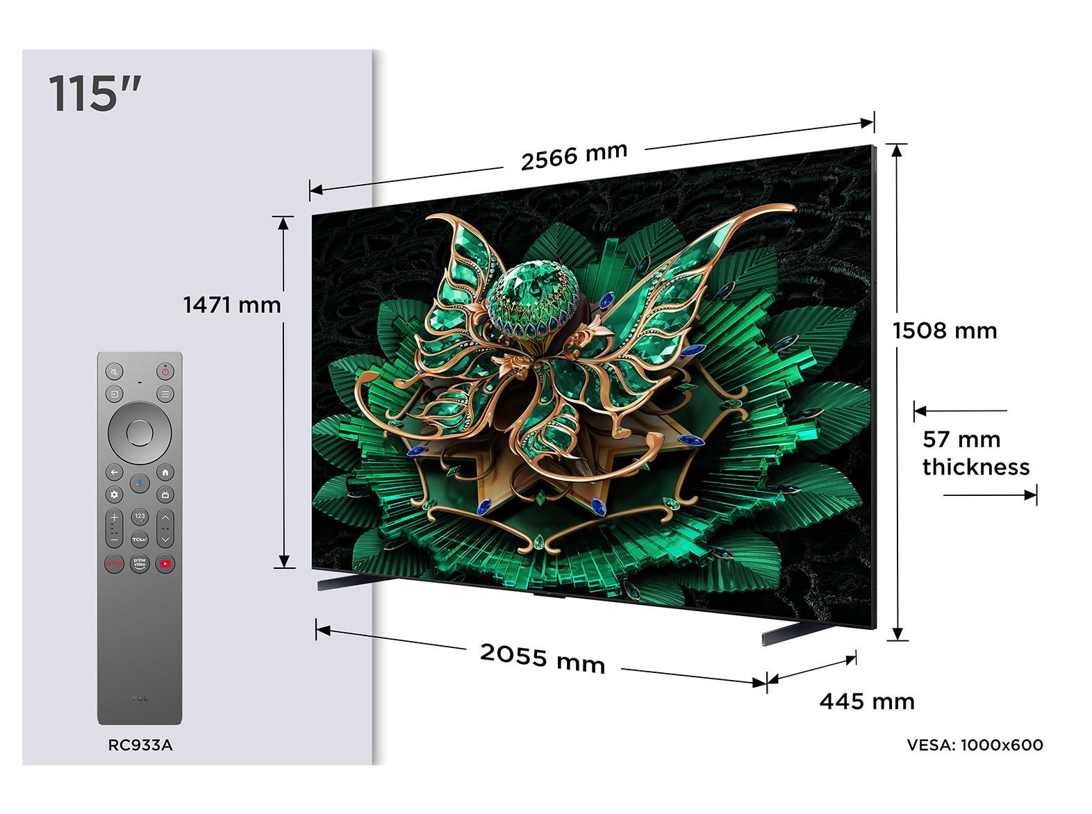 Summary: TCL 115C7K. Display diagonal: 2.92 m (115"), Display resolution: 3840 x 2160 pixels, HD type: 4K Ultra HD, Display technology: QD-Mini LED, Screen shape: Flat, LED backlighting type: Mini LED. Smart TV. Motion interpolation technology: PPI (Picture Performance Index) 4600, Display brightness: 3000 cd/m², Response time: 5.7 ms, Native aspect ratio: 16:9. Digital signal format system: DVB-C, DVB-S2, DVB-T2. Wi-Fi, Ethernet LAN. Product colour: Black